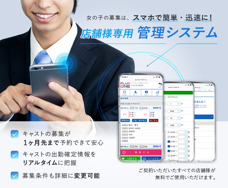 最短30分から派遣可能プラスワンでは、独自の登録キャストネットワークと、リアルタイム派遣状況システムにより店舗様のキャストが必要なタイミングに、迅速にお応えする仕組みを構築しています。